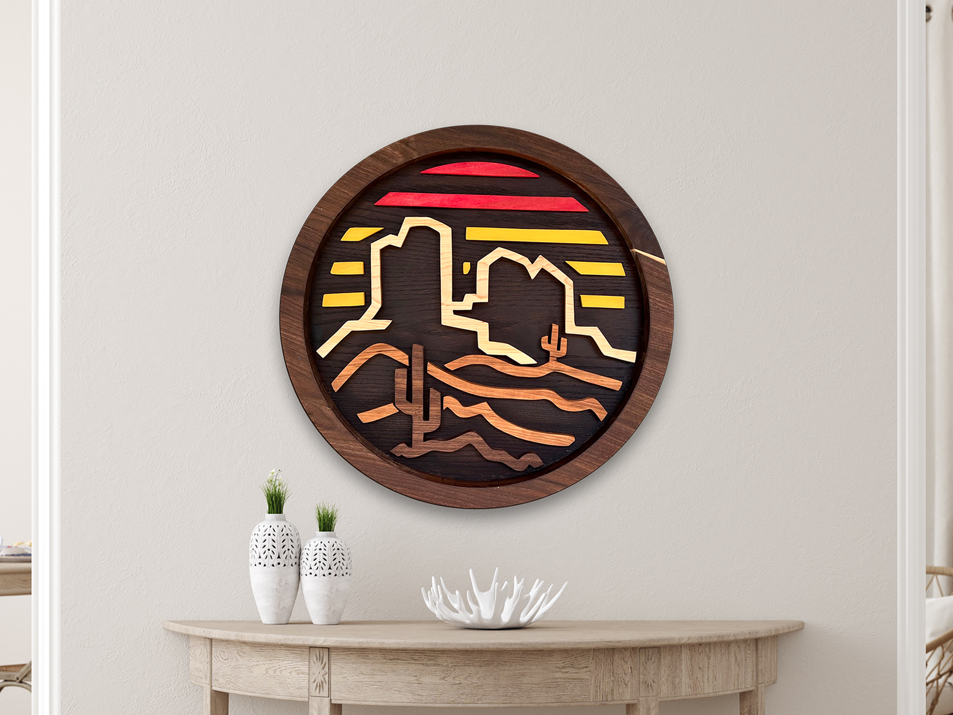 These are not mass produced - Each one is made by my own two hands, and was designed by my own one brain. There are a lot of desert wall art pieces out there, and this is my own unique spin on it.